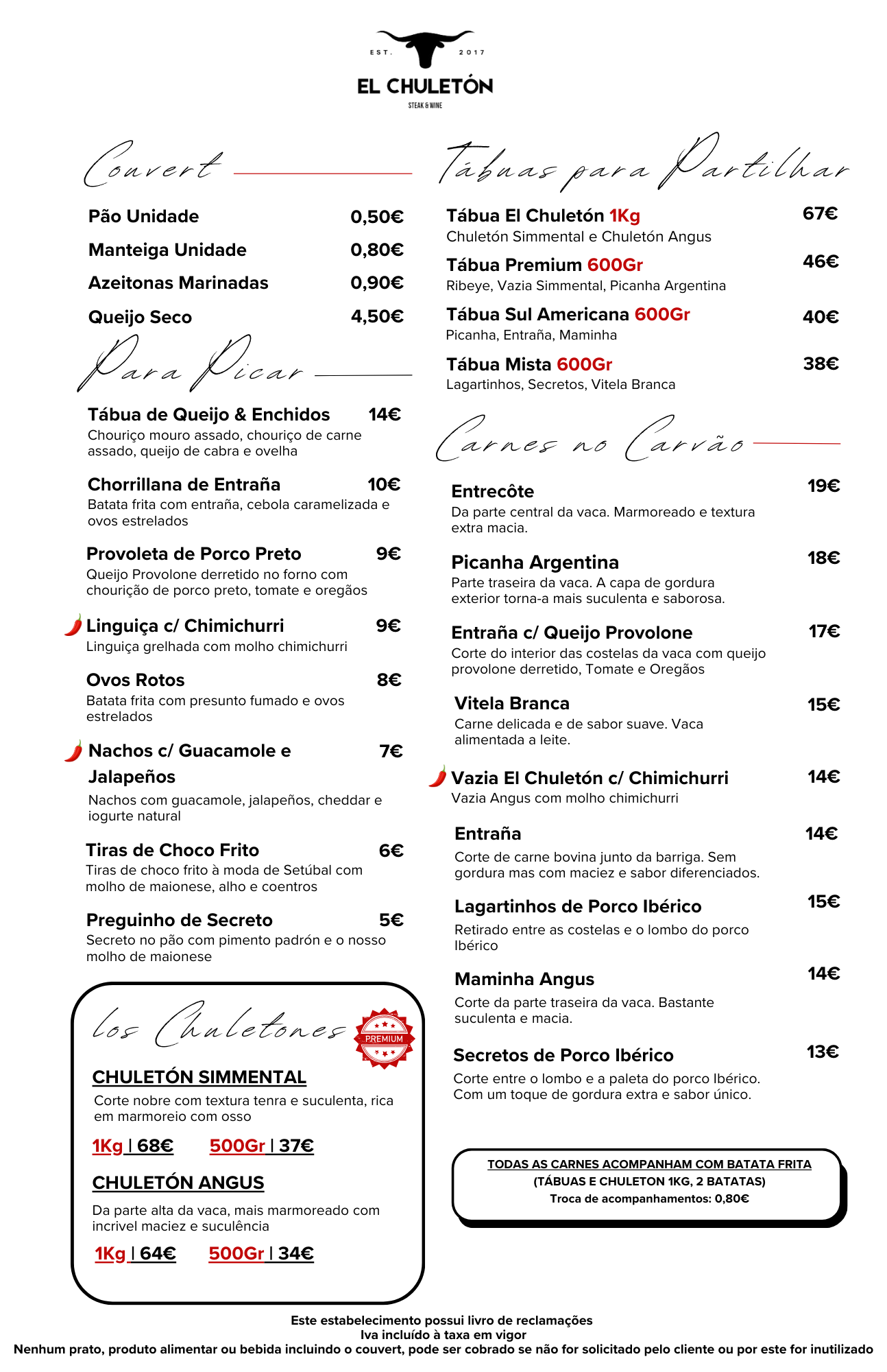 Desde 2017, o El Chuleton Steak & Wine tem sido um ex-libris para os apreciadores de carnes grelhadas no carvão em Carnaxide. Num ambiente descontraído e acolhedor, o nosso restaurante é o local ideal para uma multiplicidade de ocasiões, desde um jantar a dois a celebrações com amigos e familiares.